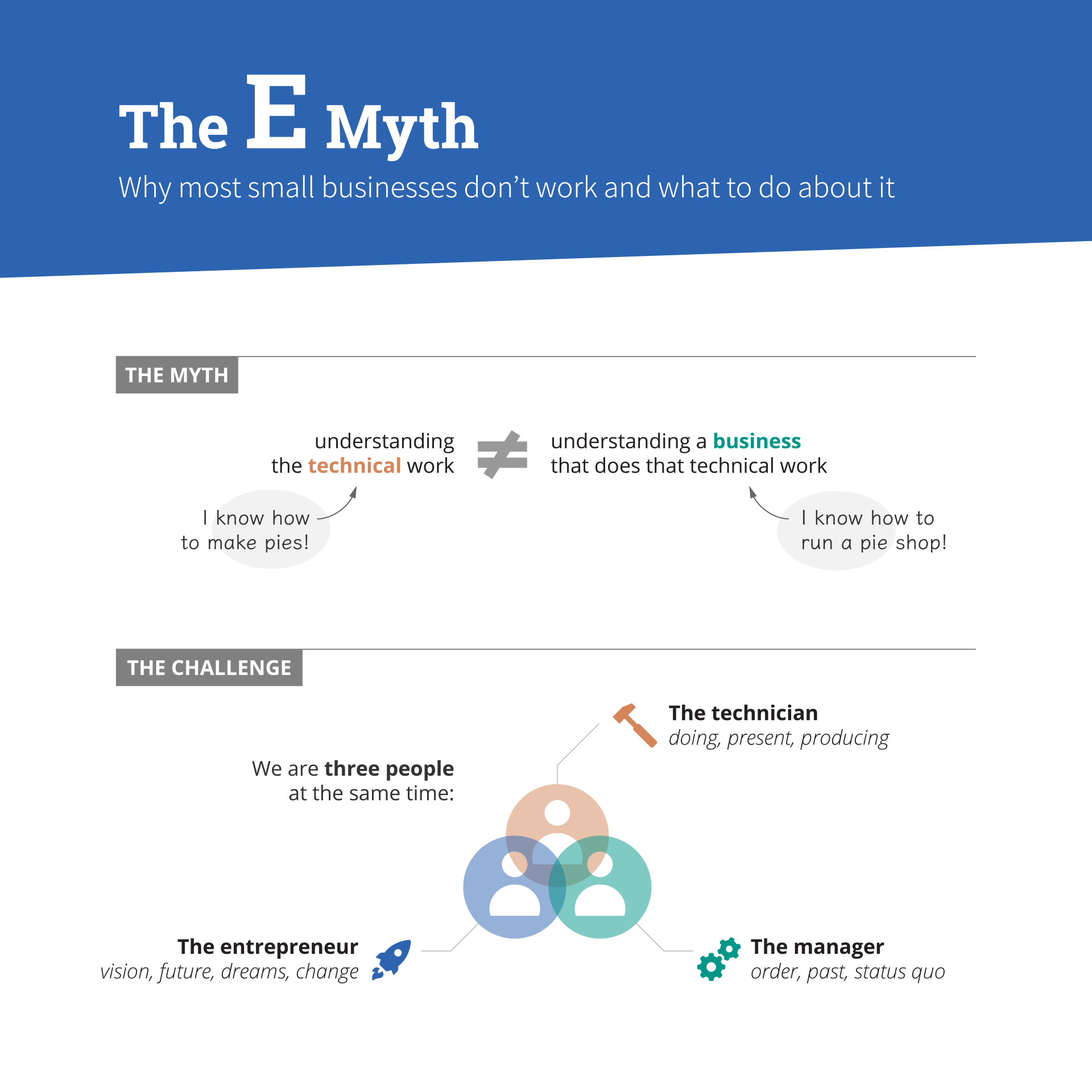 Ready to learn the most important takeaways from The E-Myth Revisited in less than two minutes. The E-Myth Summary A business owner should be three-dimensional. There is a myth in this country the E-Myth that says that small.